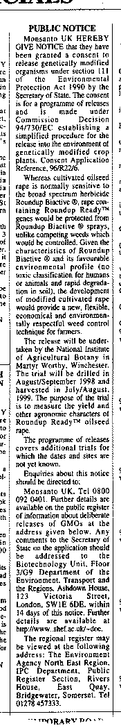Conditions :- these are things that the applicant must do in order to comply with the terms of the consent. This generally includes 'notification/advertisement of details of locations of all release sites and reporting.' This means that the applicants are legally obliged to publish a notice giving information on the whereabouts of each new sowing of GM crops in the local paper of the affected area (see below). The applicants are also required to inform the Advisory Committee on Releases to the Environment (ACRE) if anything unexpected happens to their crop. The conditions almost always end with, 'see consent schedule' (see below).