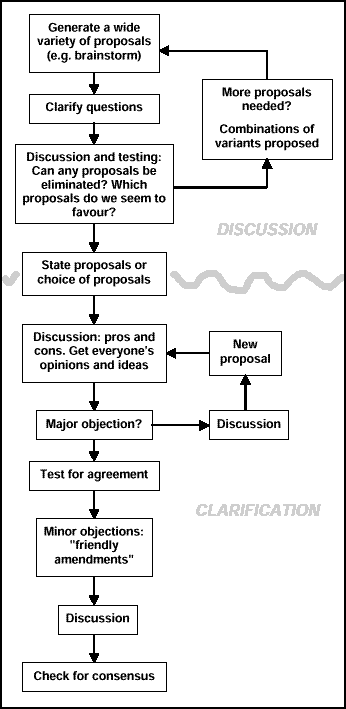Each group needs to develop a decision-making process that fits its unique circumstances. The balance between planning and spontaneity, between formal processes and informal free-for-alls, is always alive, dynamic and changing. No one way will work for every group.